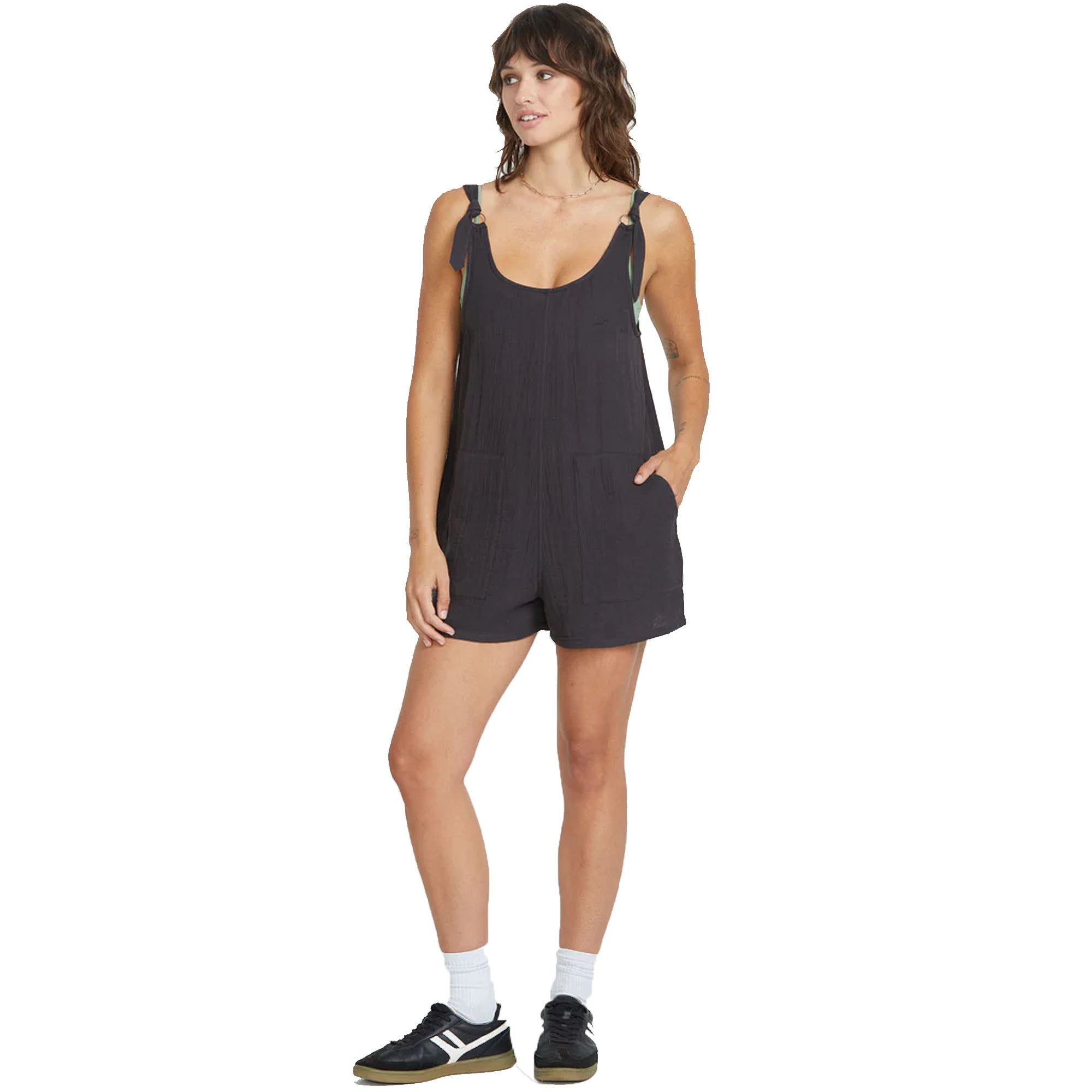 Relaxed fitting shorts romper with adjustable shoulder straps